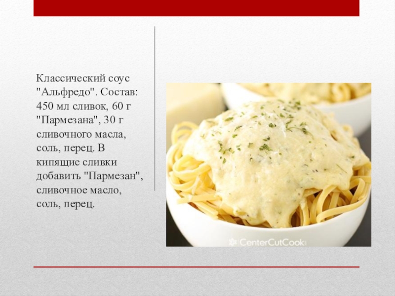Слайд 8Классический соус "Альфредо". Состав: 450 мл сливок, 60 г "Пармезана", 30