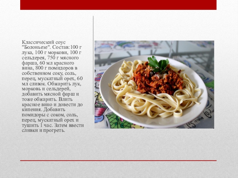 Слайд 5Классический соус "Болоньезе". Состав:100 г лука, 100 г моркови, 100 г