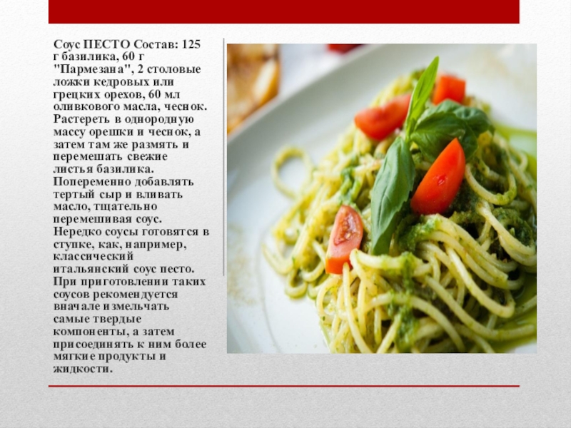 Слайд 6Соус ПЕСТО Состав: 125 г базилика, 60 г "Пармезана", 2 столовые