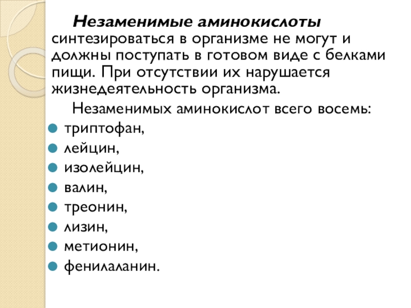 Слайд 5Незаменимые аминокислоты синтезироваться в организме не могут и должны поступать в