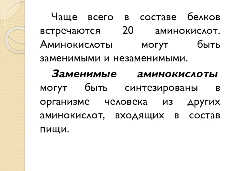Слайд 4Чаще всего в составе белков встречаются 20 аминокислот. Аминокислоты могут быть