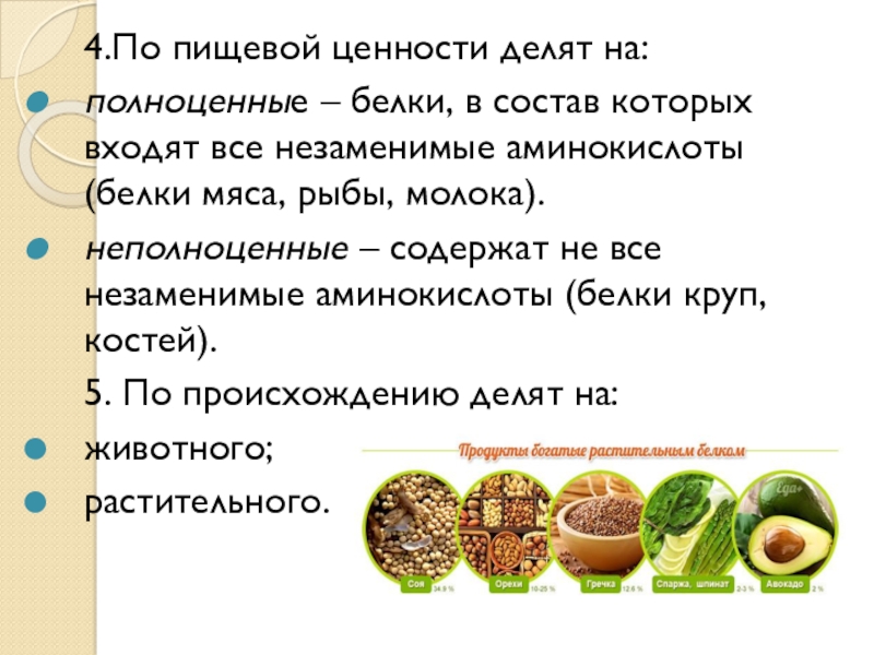 неполноценные – содержат не все незаменимые аминокислоты (белки круп, костей).