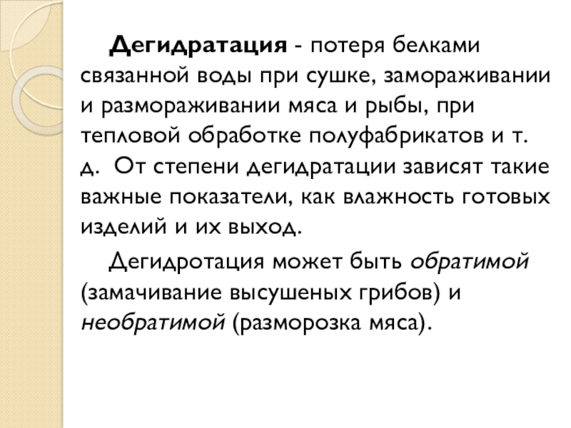 Дегидротация может быть обратимой (замачивание высушеных грибов) и необратимой (разморозка мяса).