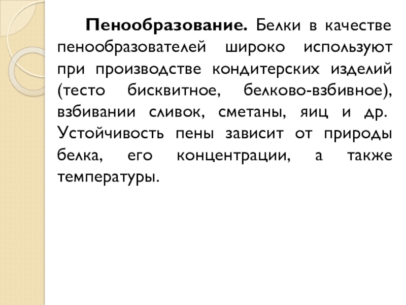 (тесто бисквитное, белково-взбивное), взбивании сливок, сметаны, яиц и др. Устойчивость пены зависит от природы белка, его концентрации, а также температуры.