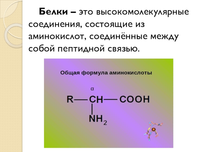 Слайд 2Белки – это высокомолекулярные соединения, состоящие из аминокислот, соединённые между собой
