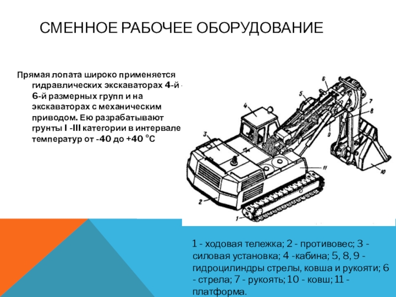 1 - ходовая тележка; 2 - противовес; 3 - силовая установка; 4 -кабина; 5, 8, 9 - гидроцилиндры стрелы, ковша и рукояти; 6 - стрела; 7 - рукоять; 10 - ковш; 11 - платформа.