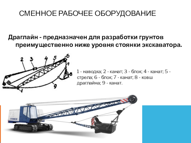1 - наводка; 2 - канат; 3 - блок; 4 - канат; 5 - стрела; 6 - блок; 7 - канат; 8 - ковш драглайна; 9 - канат.