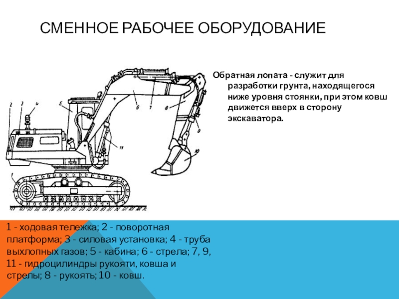 1 - ходовая тележка; 2 - поворотная платформа; 3 - силовая установка; 4 - труба выхлопных газов; 5 - кабина; 6 - стрела; 7, 9, 11 - гидроцилиндры рукояти, ковша и стрелы; 8 - рукоять; 10 - ковш.