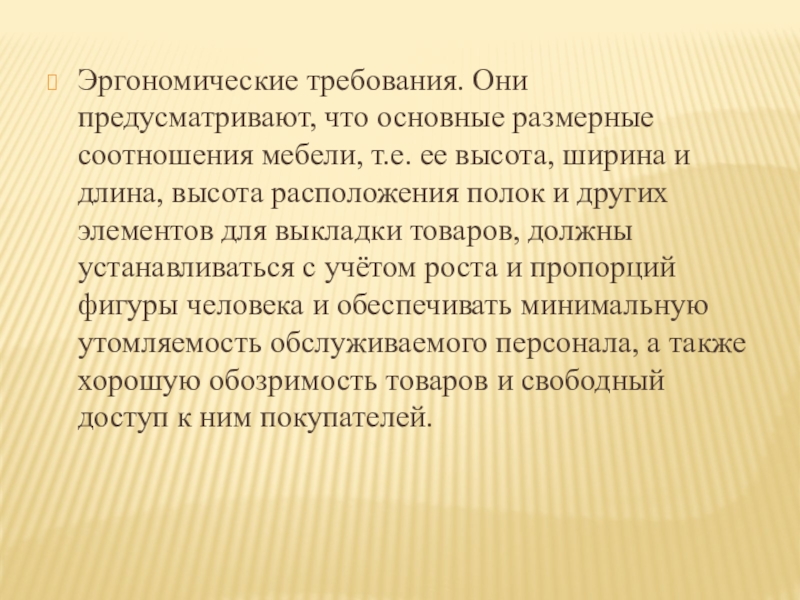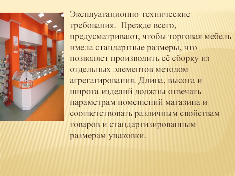 Слайд 13Эксплуатационно-технические требования. Прежде всего, предусматривают, чтобы торговая мебель имела стандартные размеры,