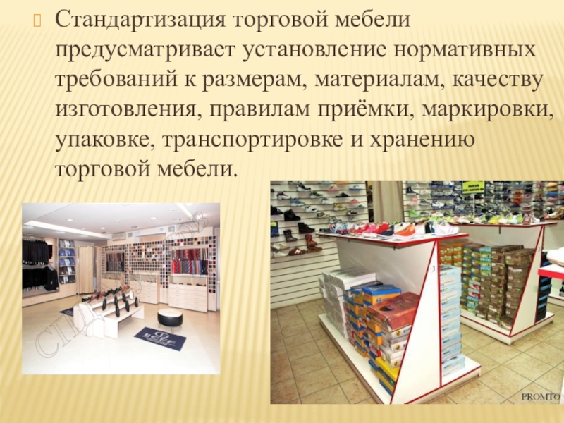 Слайд 11Стандартизация торговой мебели предусматривает установление нормативных требований к размерам, материалам, качеству