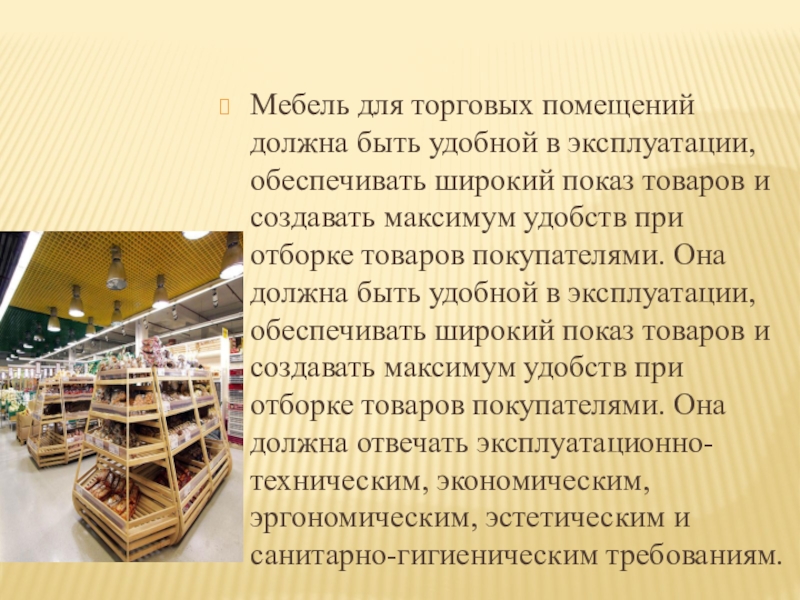 Слайд 12Мебель для торговых помещений должна быть удобной в эксплуатации, обеспечивать широкий
