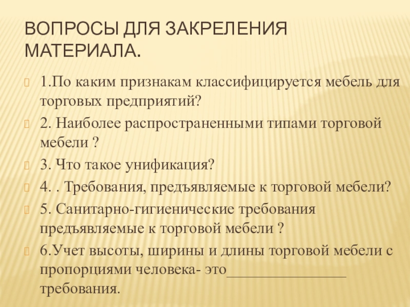 1.По каким признакам классифицируется мебель для торговых предприятий?