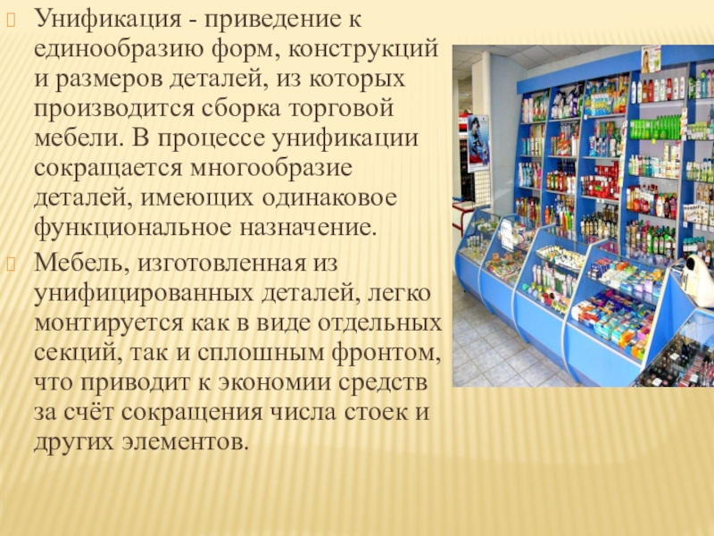 которых производится сборка торговой мебели. В процессе унификации сокращается многообразие деталей, имеющих одинаковое функциональное назначение.