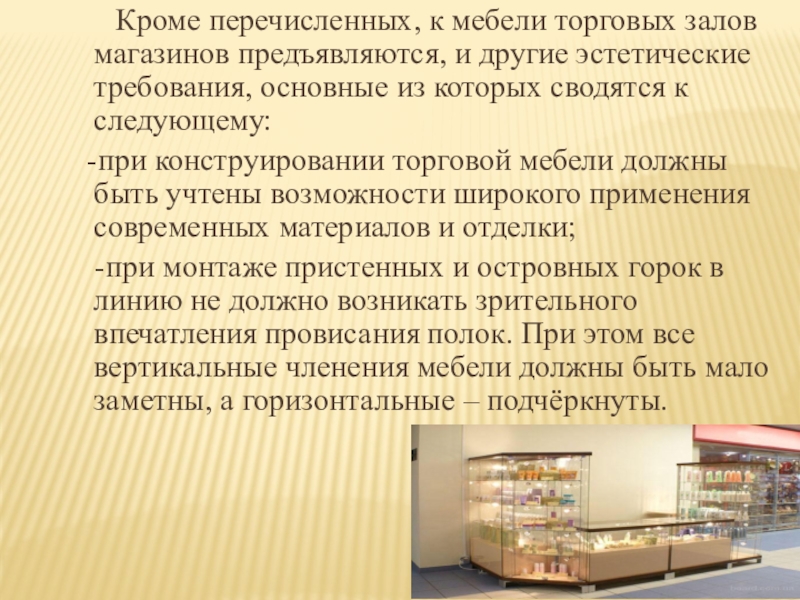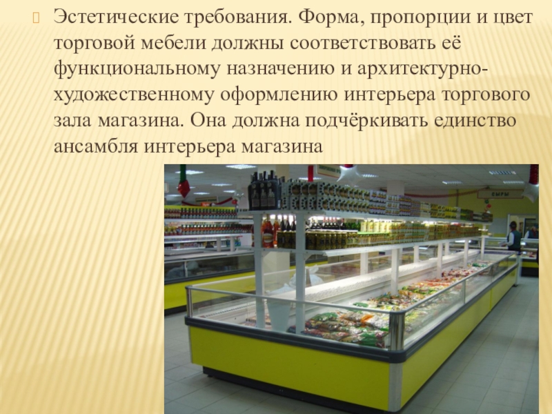 Слайд 16Эстетические требования. Форма, пропорции и цвет торговой мебели должны соответствовать её