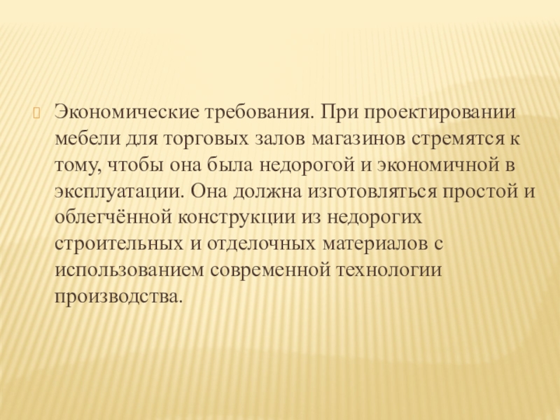 Слайд 14Экономические требования. При проектировании мебели для торговых залов магазинов стремятся к