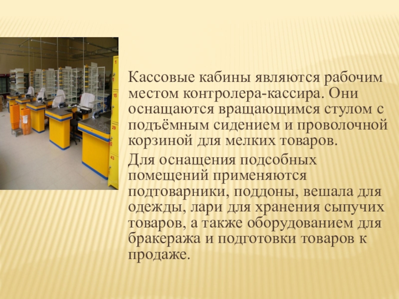 Слайд 9Кассовые кабины являются рабочим местом контролера-кассира. Они оснащаются вращающимся стулом с