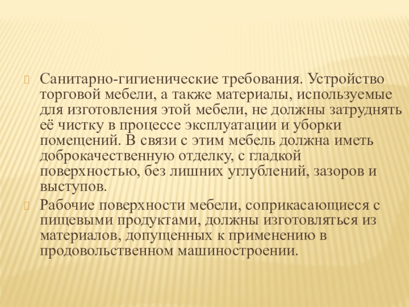 Слайд 19Санитарно-гигиенические требования. Устройство торговой мебели, а также материалы, используемые для изготовления