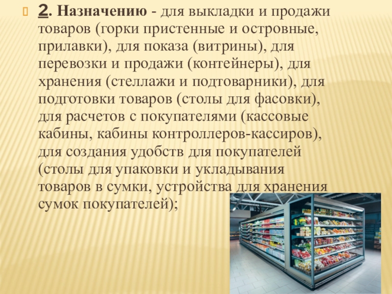прилавки), для показа (витрины), для перевозки и продажи (контейнеры), для хранения (стеллажи и подтоварники), для подготовки товаров (столы для фасовки), для расчетов с покупателями (кассовые кабины, кабины контроллеров-кассиров), для создания удобств для покупателей (столы для упаковки и укладывания товаров в сумки, устройства для хранения сумок покупателей);
