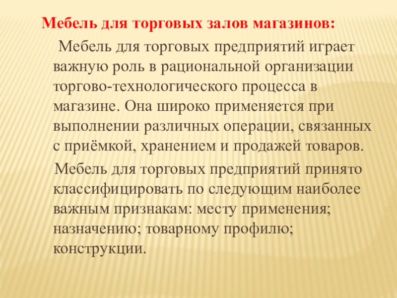 Мебель для торговых предприятий принято классифицировать по следующим наиболее важным признакам: месту применения; назначению; товарному профилю; конструкции.