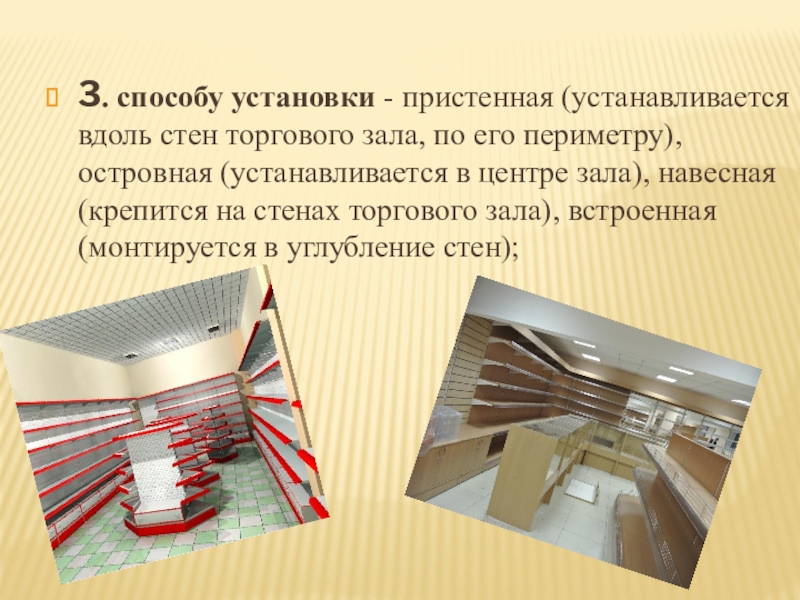 периметру), островная (устанавливается в центре зала), навесная (крепится на стенах торгового зала), встроенная (монтируется в углубление стен);
