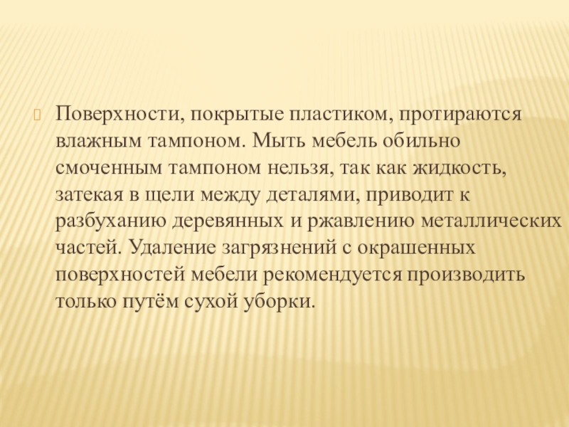 Слайд 20Поверхности, покрытые пластиком, протираются влажным тампоном. Мыть мебель обильно смоченным тампоном
