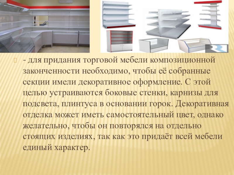 Слайд 18- для придания торговой мебели композиционной законченности необходимо, чтобы её собранные