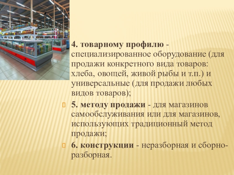 Слайд 74. товарному профилю - специализированное оборудование (для продажи конкретного вида товаров: хлеба,