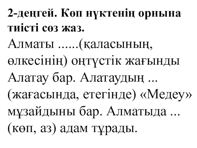 Слайд 132-деңгей. Көп нүктенің орнына тиісті сөз жаз. Алматы ......(қаласының, өлкесінің) оңтүстік жағынды