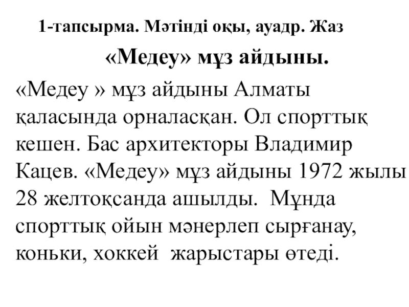1-тапсырма. Мәтінді оқы, ауадр. Жаз «Медеу» мұз айдыны.«Медеу » мұз айдыны Алматы қаласында орналасқан. Ол