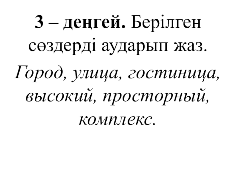 3 – деңгей. Берілген сөздерді аударып жаз.Город, улица, гостиница, высокий, просторный, комплекс.