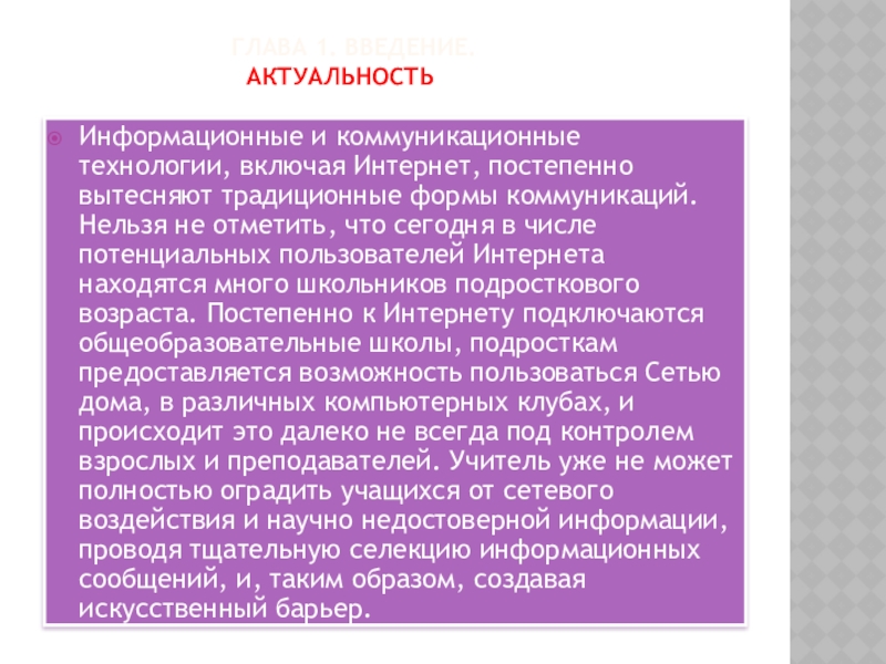 Информационные и коммуникационные технологии, включая Интернет, постепенно вытесняют традиционные формы коммуникаций. Нельзя не отметить, что сегодня в числе потенциальных пользователей Интернета находятся много школьников подросткового возраста. Постепенно к Интернету подключаются общеобразовательные школы, подросткам предоставляется возможность пользоваться Сетью дома, в различных компьютерных клубах, и происходит это далеко не всегда под контролем взрослых и преподавателей. Учитель уже не может полностью оградить учащихся от сетевого воздействия и научно недостоверной информации, проводя тщательную селекцию информационных сообщений, и, таким образом, создавая искусственный барьер.