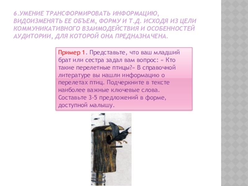 Пример 1. Представьте, что ваш младший брат или сестра задал вам вопрос: « Кто такие перелетные птицы?» В справочной литературе вы нашли информацию о перелетах птиц. Подчеркните в тексте наиболее важные ключевые слова. Составьте 3-5 предложений в форме, доступной малышу.