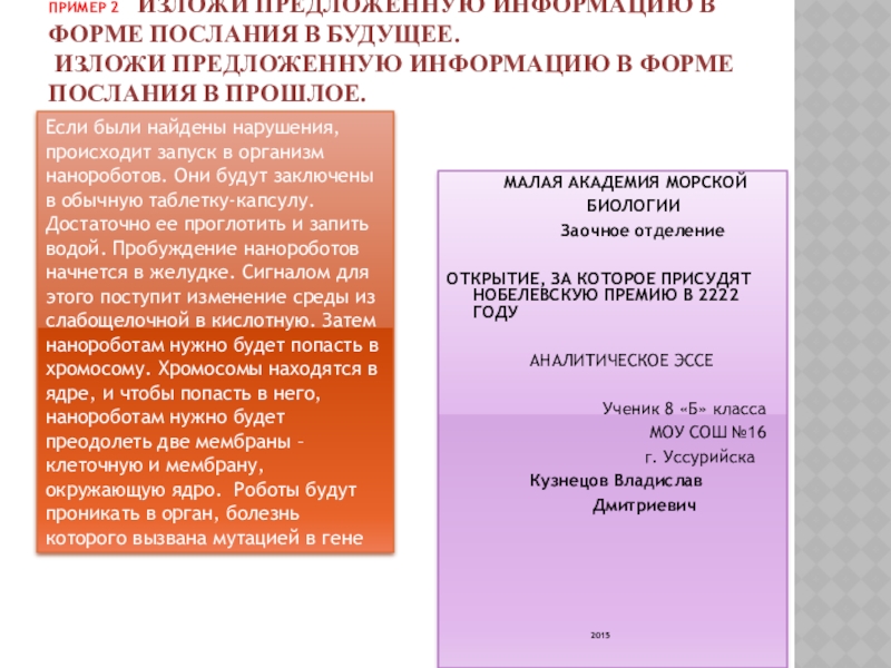 Если были найдены нарушения, происходит запуск в организм нанороботов. Они будут заключены в обычную таблетку-капсулу. Достаточно ее проглотить и запить водой. Пробуждение нанороботов начнется в желудке. Сигналом для этого поступит изменение среды из слабощелочной в кислотную. Затем нанороботам нужно будет попасть в хромосому. Хромосомы находятся в ядре, и чтобы попасть в него, нанороботам нужно будет преодолеть две мембраны – клеточную и мембрану, окружающую ядро. Роботы будут проникать в орган, болезнь которого вызвана мутацией в гене