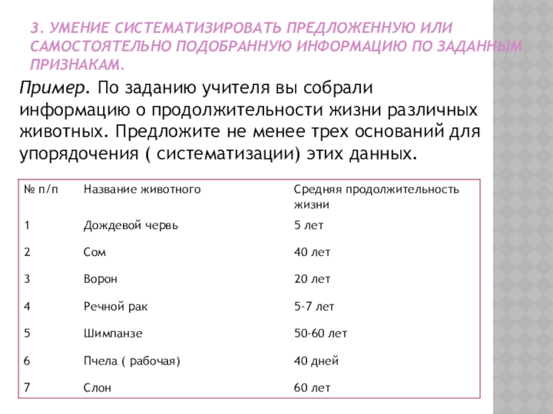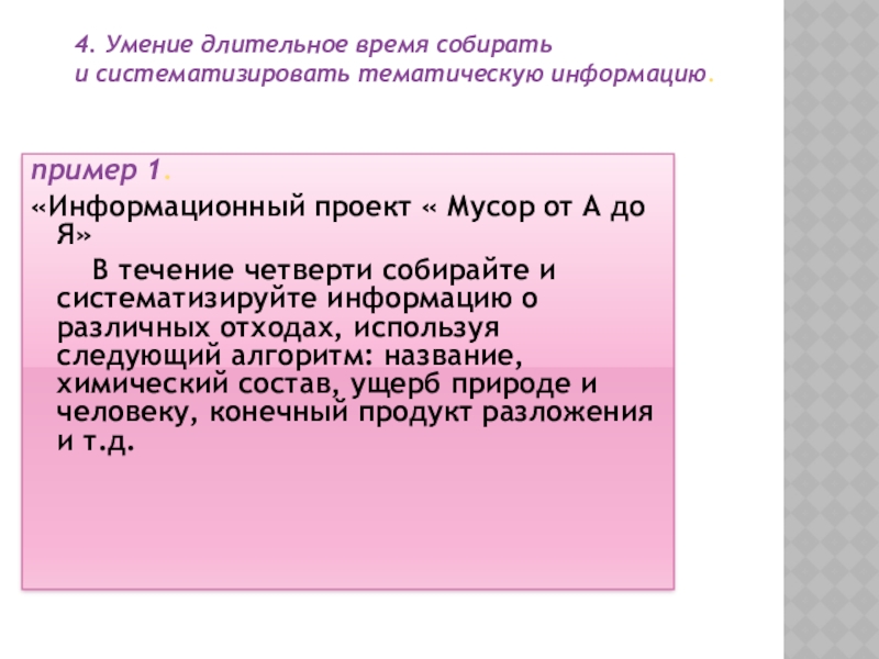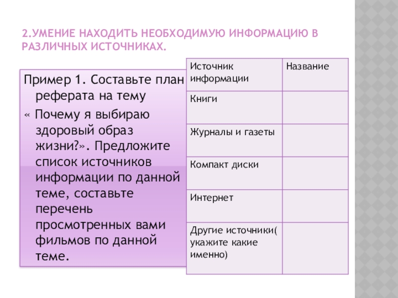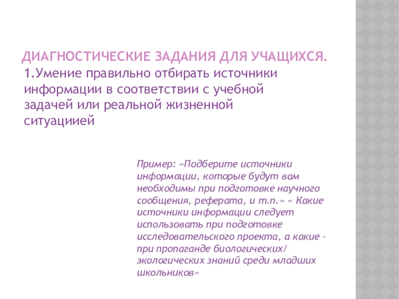 Пример: «Подберите источники информации, которые будут вам необходимы при подготовке научного сообщения, реферата, и т.п.» « Какие источники информации следует использовать при подготовке исследовательского проекта, а какие – при пропаганде биологических/ экологических знаний среди младших школьников»