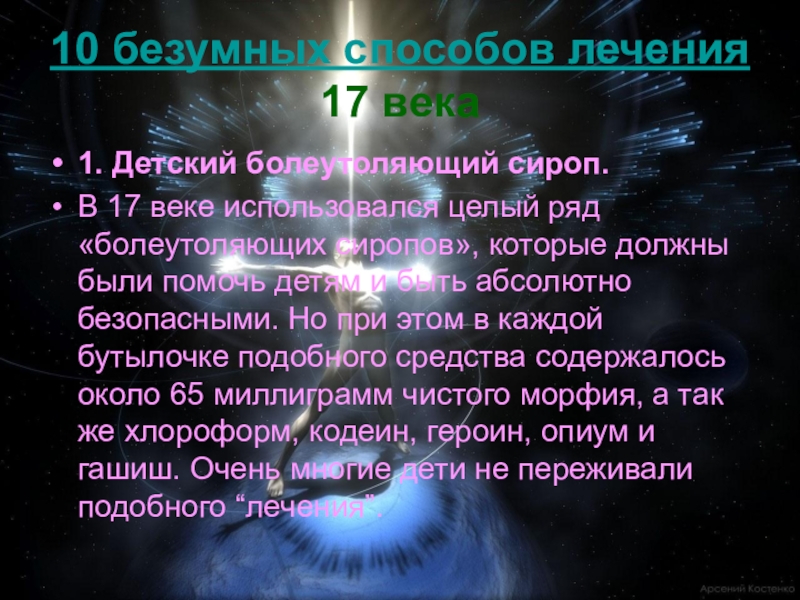 целый ряд «болеутоляющих сиропов», которые должны были помочь детям и быть абсолютно безопасными. Но при этом в каждой бутылочке подобного средства содержалось около 65 миллиграмм чистого морфия, а так же хлороформ, кодеин, героин, опиум и гашиш. Очень многие дети не переживали подобного “лечения”.