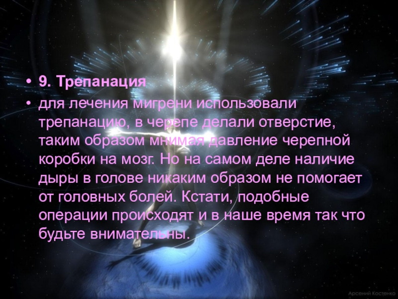 образом мнимая давление черепной коробки на мозг. Но на самом деле наличие дыры в голове никаким образом не помогает от головных болей. Кстати, подобные операции происходят и в наше время так что будьте внимательны.
