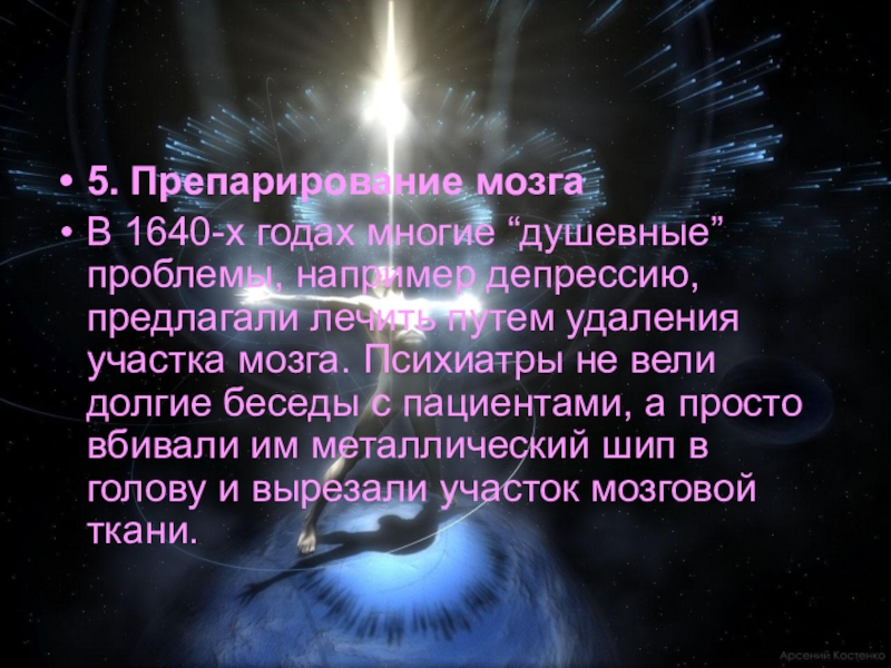 лечить путем удаления участка мозга. Психиатры не вели долгие беседы с пациентами, а просто вбивали им металлический шип в голову и вырезали участок мозговой ткани.