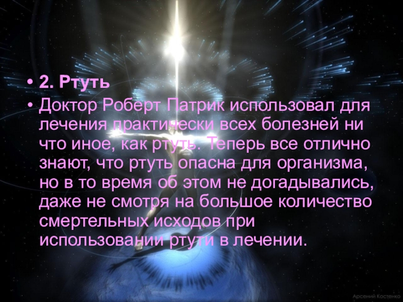что иное, как ртуть. Теперь все отлично знают, что ртуть опасна для организма, но в то время об этом не догадывались, даже не смотря на большое количество смертельных исходов при использовании ртути в лечении.