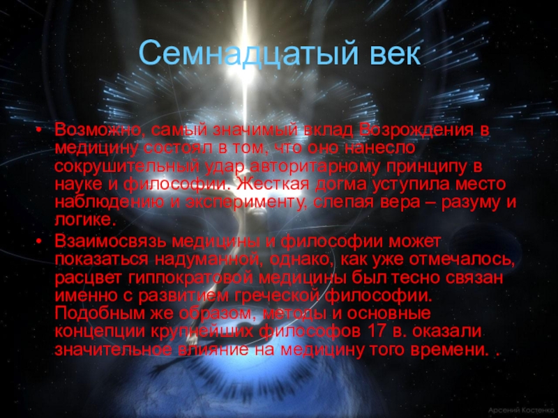 Взаимосвязь медицины и философии может показаться надуманной, однако, как уже отмечалось, расцвет гиппократовой медицины был тесно связан именно с развитием греческой философии. Подобным же образом, методы и основные концепции крупнейших философов 17 в. оказали значительное влияние на медицину того времени. .