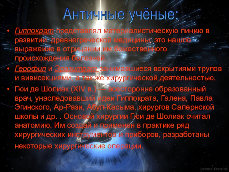 Слайд 10Гиппократ представлял материалистическую линию в развитии древнегреческой медицины; это нашло выражение