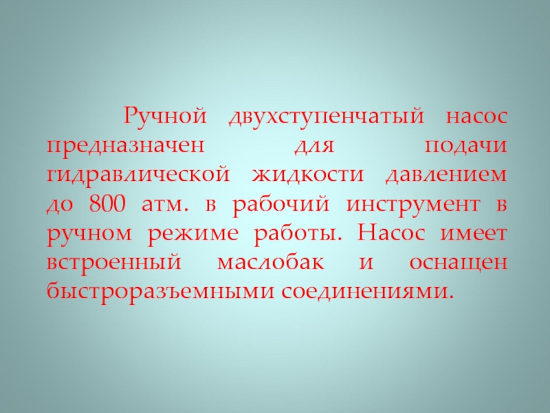 Слайд 16 Ручной двухступенчатый насос предназначен для подачи гидравлической жидкости давлением