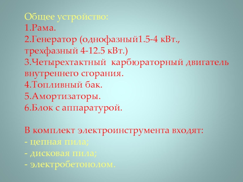 Слайд 19Общее устройство: 1.Рама. 2.Генератор (однофазный1.5-4 кВт., трехфазный 4-12.5 кВт.) 3.Четырехтактный карбюраторный двигатель внутреннего сгорания. 4.Топливный