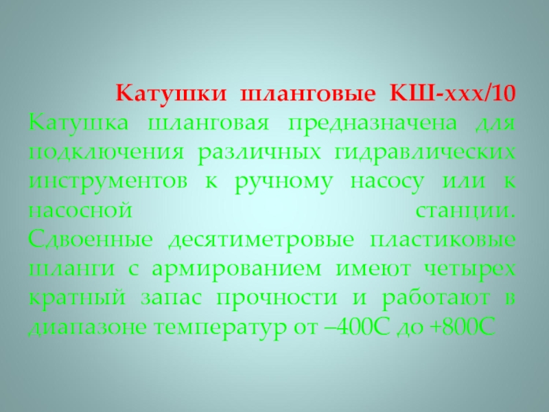 Слайд 13 Катушки шланговые КШ-ххх/10 Катушка шланговая предназначена для