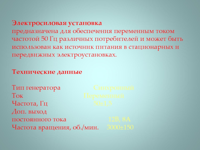 Электросиловая установка  предназначена для обеспечения переменным током частотой 50 Гц различных потребителей и может