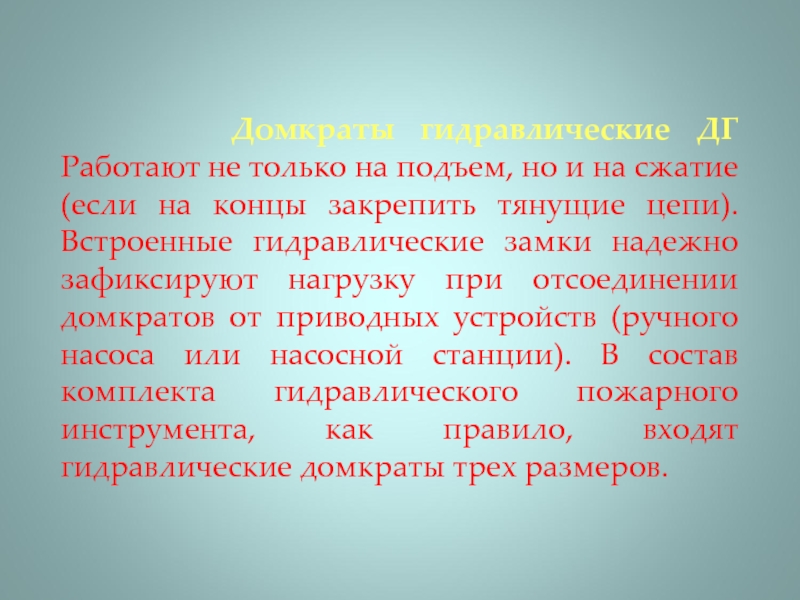 но и на сжатие (если на концы закрепить тянущие цепи). Встроенные гидравлические замки надежно зафиксируют нагрузку при отсоединении домкратов от приводных устройств (ручного насоса или насосной станции). В состав комплекта гидравлического пожарного инструмента, как правило, входят гидравлические домкраты трех размеров.