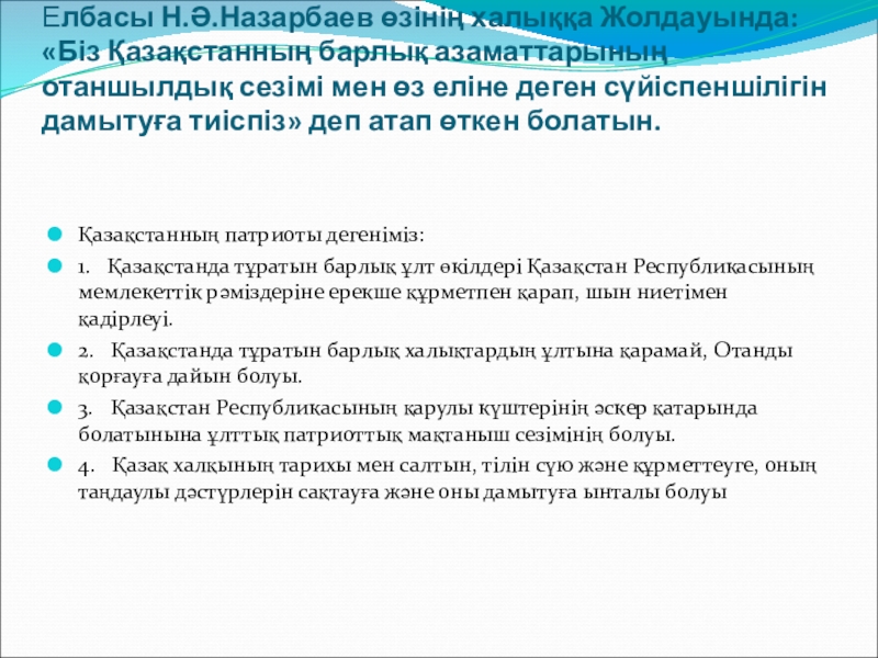 4. Қазақ халқының тарихы мен салтын, тілін сүю және құрметтеуге, оның таңдаулы дәстүрлерін сақтауға және оны дамытуға ынталы болуы