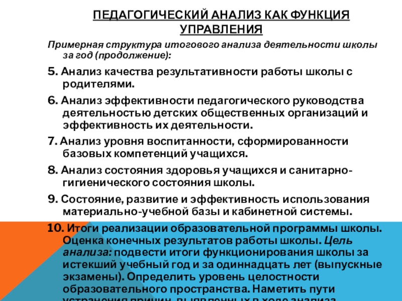 10. Итоги реализации образовательной программы школы. Оценка конечных результатов работы школы. Цель анализа: подвести итоги функционирования школы за истекший учебный год и за одиннадцать лет (выпускные экзамены). Определить уровень целостности образовательного пространства. Наметить пути устранения причин, выявленных в ходе анализа недостатков.
