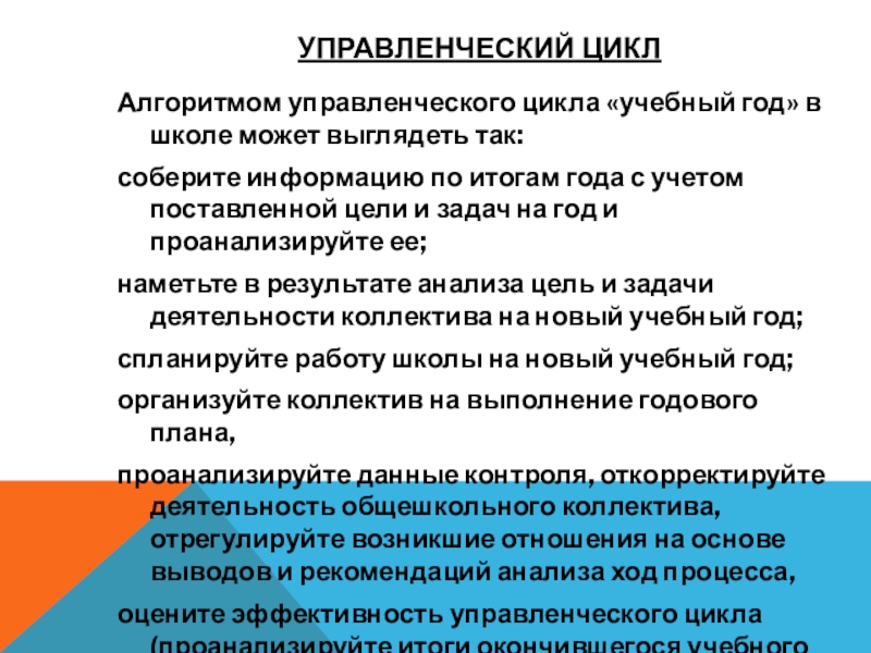 Алгоритмом управленческого цикла «учебный год» в школе может выглядеть так: