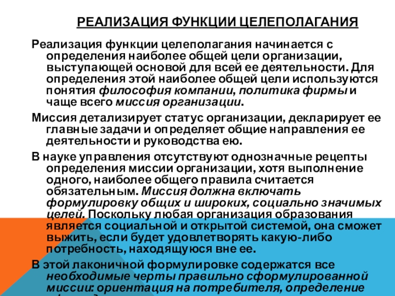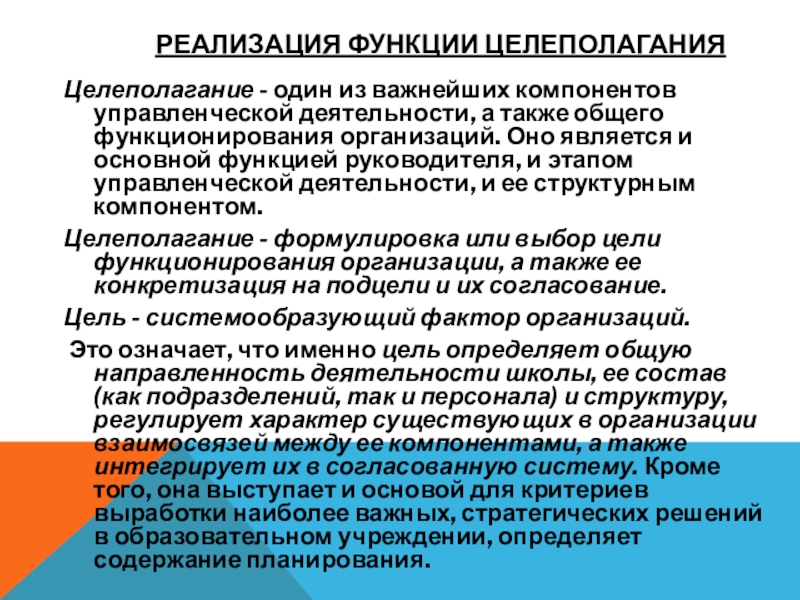 Реализация функции целеполагания начинается с определения наиболее общей цели