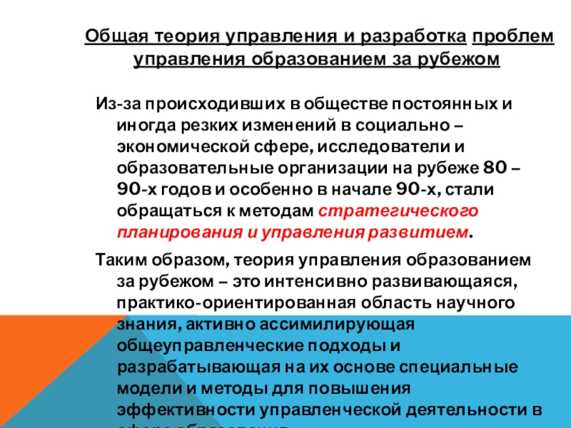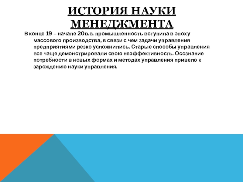 эпоху массового производства, в связи с чем задачи управления предприятиями резко усложнились. Старые способы управления все чаще демонстрировали свою неэффективность. Осознание потребности в новых формах и методах управления привело к зарождению науки управления.